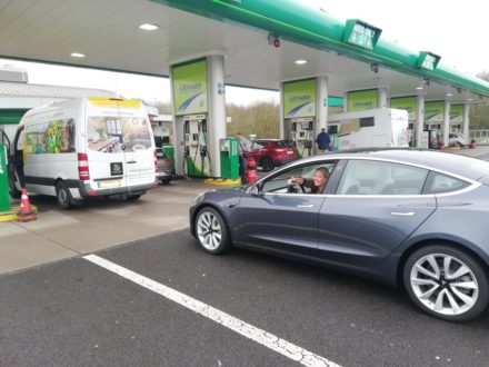 Wat doet die blonde dame met haar tesla nou bij het tank station, oh ja …die wacht om mij tot ik die bus heb afgetankt 🙂