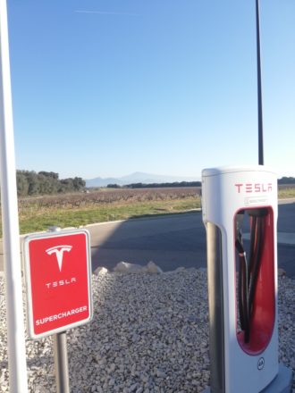 Tesla Super Charger bij orange uitzicht op de Mont Ventoux